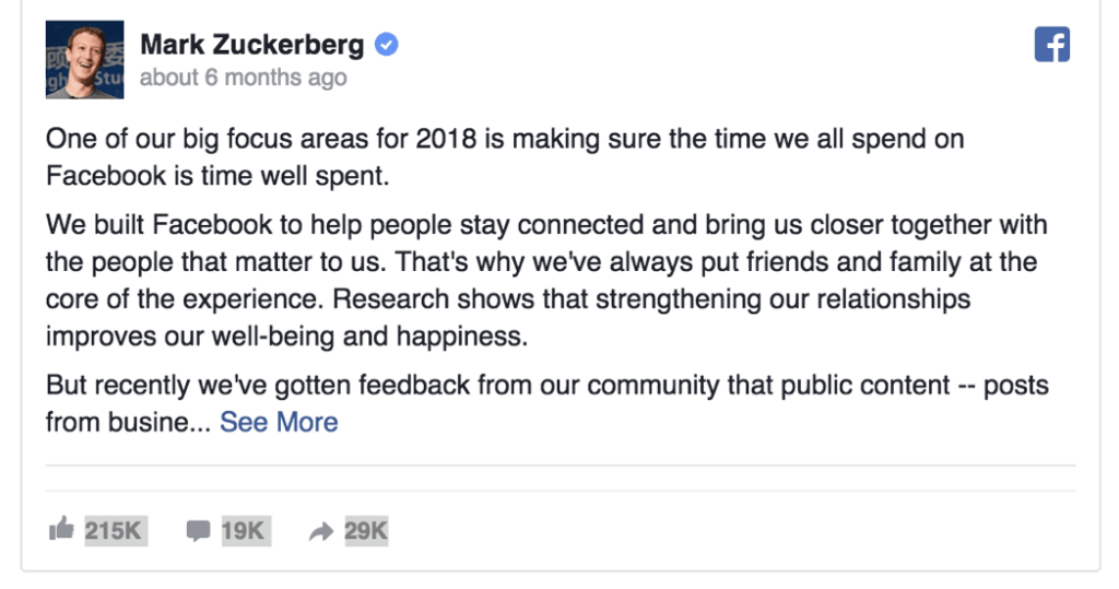 Zuckerberg himself even said outright that people want to hear more from family, friends, and groups, and that was precisely what they were going to give users, which is why posts from different groups show up so frequently and at the top of your feeds. People are often highly active in the Groups they join, and it’s a key part of that community-building feeling they were going for.