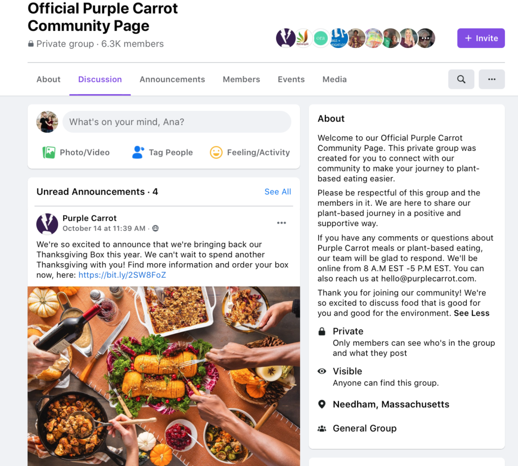 Purple Carrot’s group is a great example of this. The group has taken on a life of its own in a good way by encouraging users to share their dishes and questions, and people are happy to weigh in to make recommendations for vegan products and cooking tips. It feels like a real community.