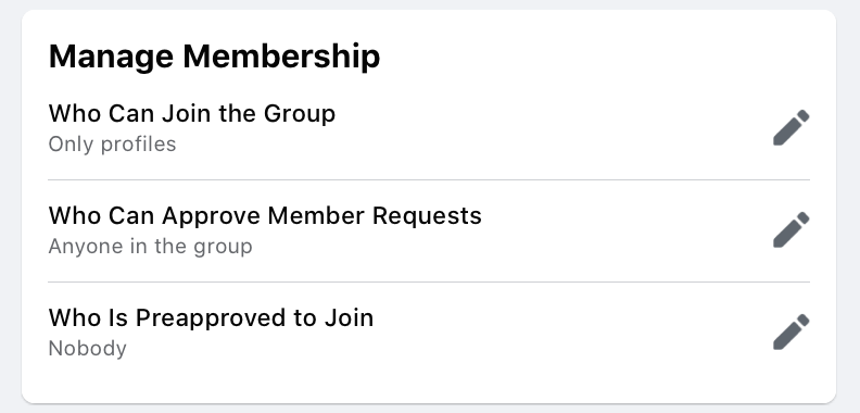 - Set membership management restrictions. Do you want everyone who can to join the group? Or would you rather it be invite-only? And can members approve each other’s requests to join, or would you like this to be an admin-only position? For heavily branded groups, having your admins in control can make the groups easier to manage. This is also under the Settings tab.