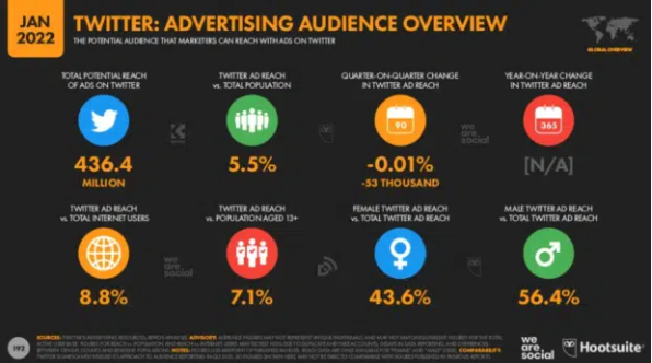- 56.4% of Twitter’s advertising audience identify as male, and 43.6% are female.