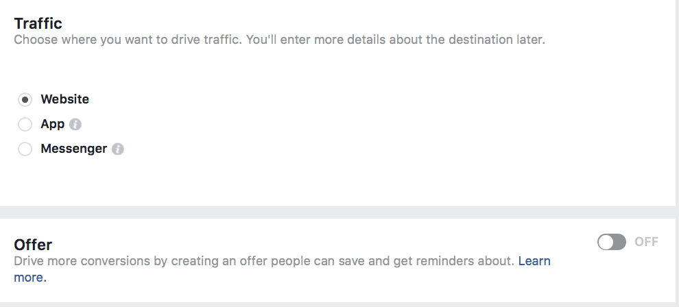 If you’re sending traffic to a secondary location with your ad, you’ll first choose where to send them. You can send them to your site, your app, or messenger to contact you.
