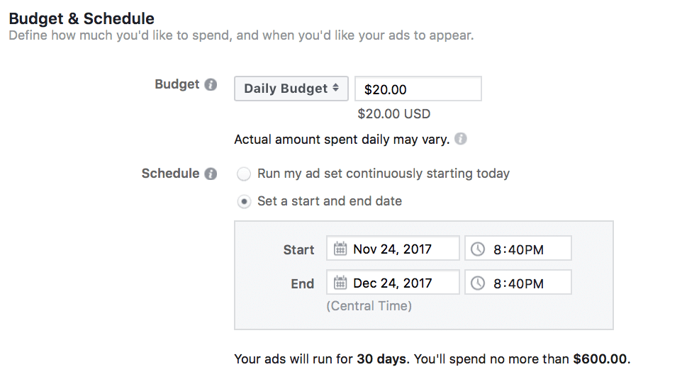 When it comes to your budget, you have two options. You can set a daily budget, or a lifetime budget. A lifetime budget can be ideal when you want Facebook to automatically distribute the ad spend for you over a set period of time, while guaranteeing you’ll never go over budget if you schedule incorrectly.