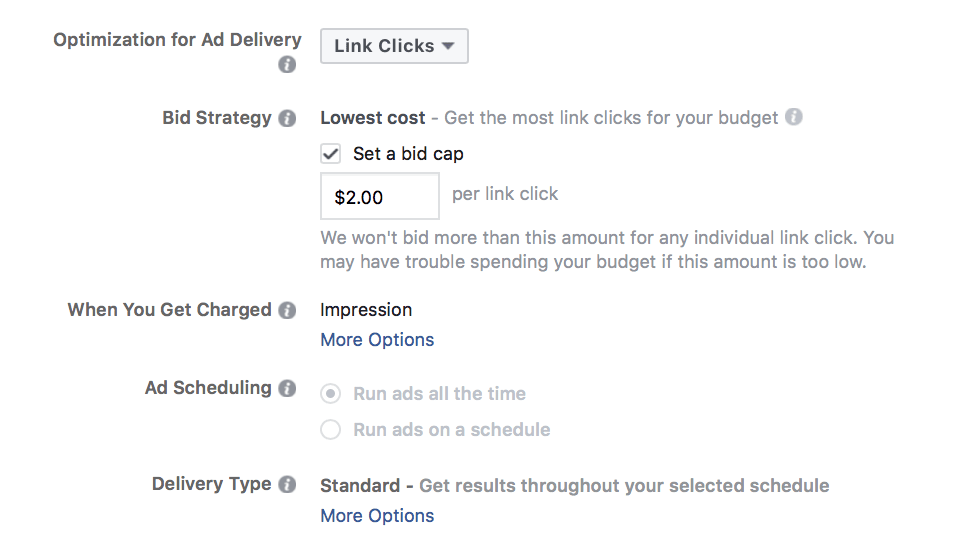 Note that you don’t have to do anything with the manual bidding. Facebook will automatically bid on your behalf, and their bids are normally good.
