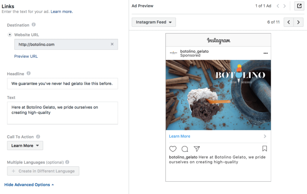 The “headline” section is a great example; while this will still show up in Facebook Ads, requiring you to fill it in, it doesn’t show up at all on Instagram Ads in their current formatting. Because of this, preview your ad in every placement before publishing it to make sure that the meaning is clear.