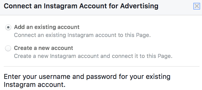 You have two choices. You can either run Instagram Ads under your Facebook Page, or you can connect your Instagram account to the ads manager. Click on the “Add an Account” button to do the latter, and it will pull up a login screen for you to sign in to your company Instagram account.