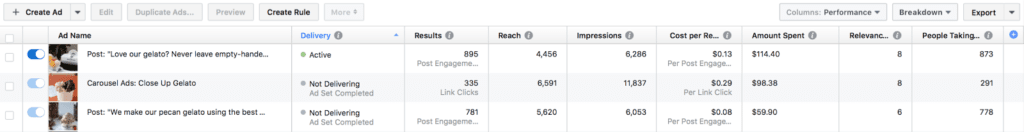 You can monitor your Instagram Ads through your Ads Manager. The Ads Manager dashboard lays out everything that you need to see at a quick glance, including relevance score, cost per action (CPA), and number of results you’re getting. While it’s good to see how much reach you’re getting, this is a number that you don’t need to focus on quite as much; the results you’re getting- and what you’re paying for them- amount to a good bit more.