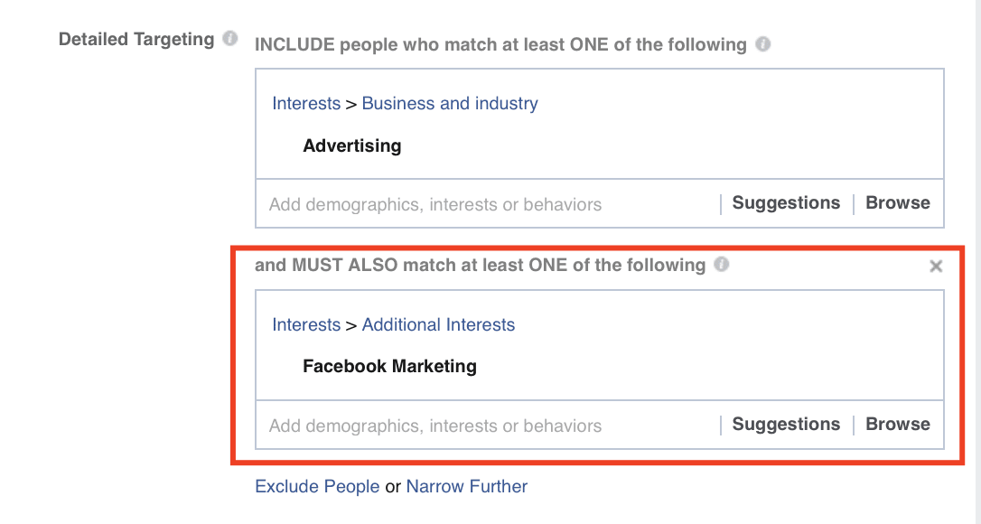 You can optimize your Facebook audiences by clicking on the “Narrow Audience” button under the Interests section.