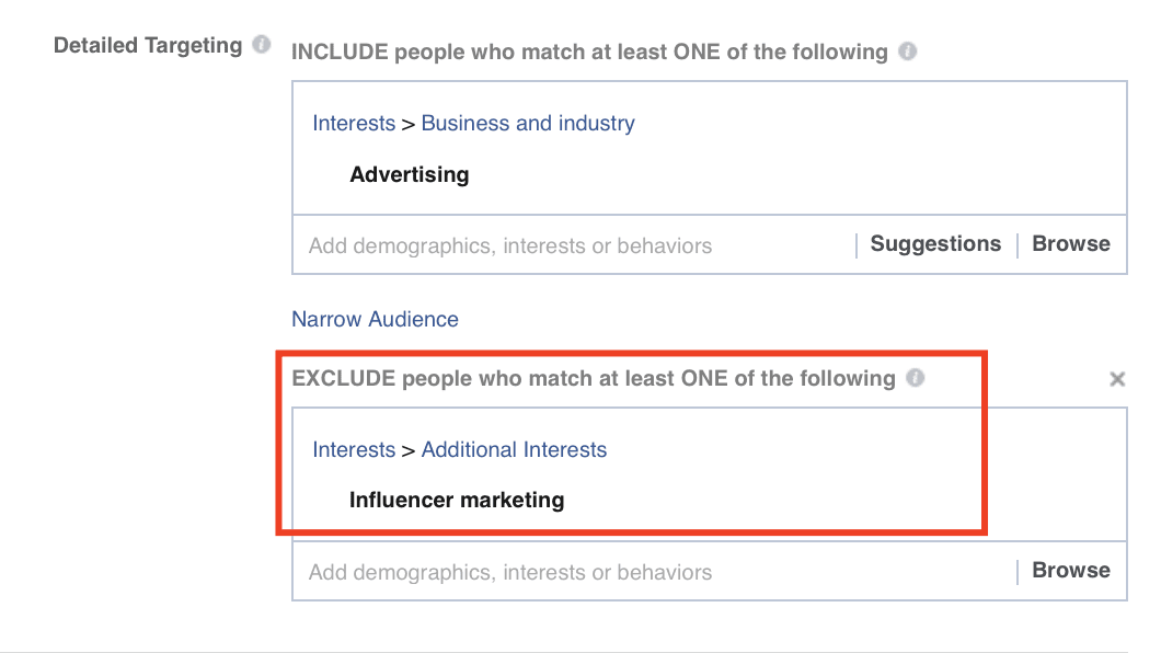 For example, AdEspresso may want to target everyone interested in advertising, but we might want to exclude the people interested in influencer marketing as that’s not our main area of focus.
