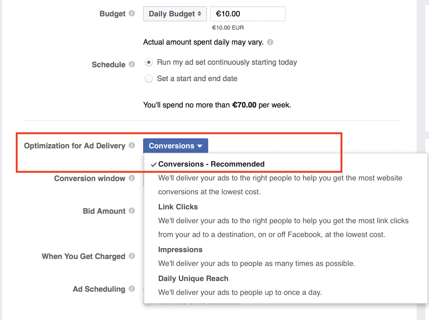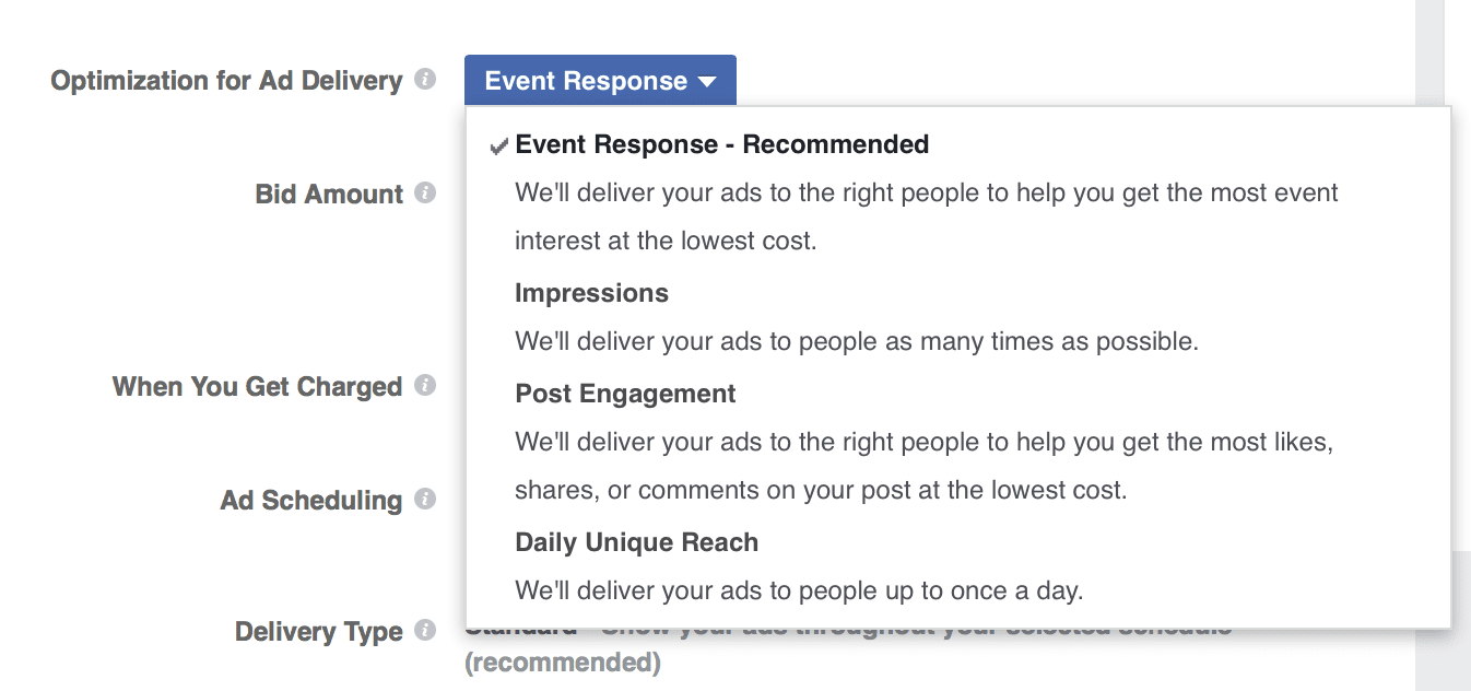 Depending on your campaign objective, Facebook will let you select between different delivery optimization methods.
