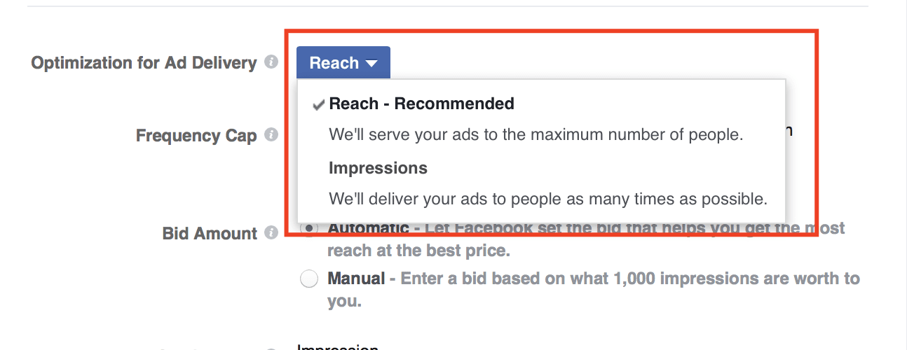 Delivery optimization options: Impressions Reach
