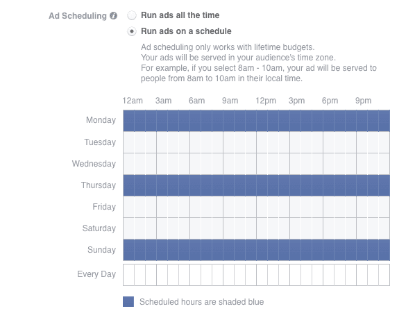 You can set up a custom Facebook advertising schedule during the campaign setup process by checking the “Run ads on a schedule” checkbox.