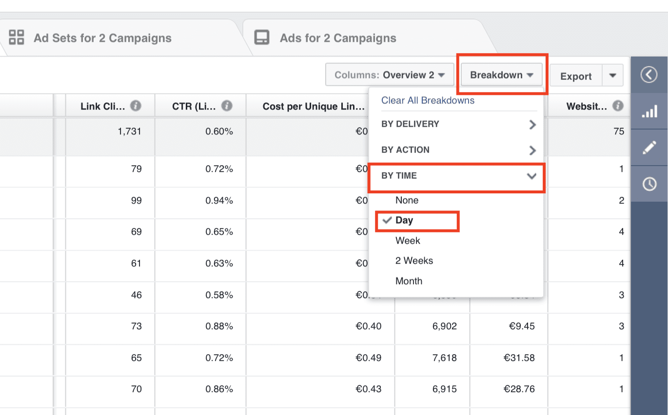 To see which weekdays contribute to the most conversions at the lowest CPA, go to your Facebook Ads Manager reports and use the Breakdown menu to break down your campaigns by Day.