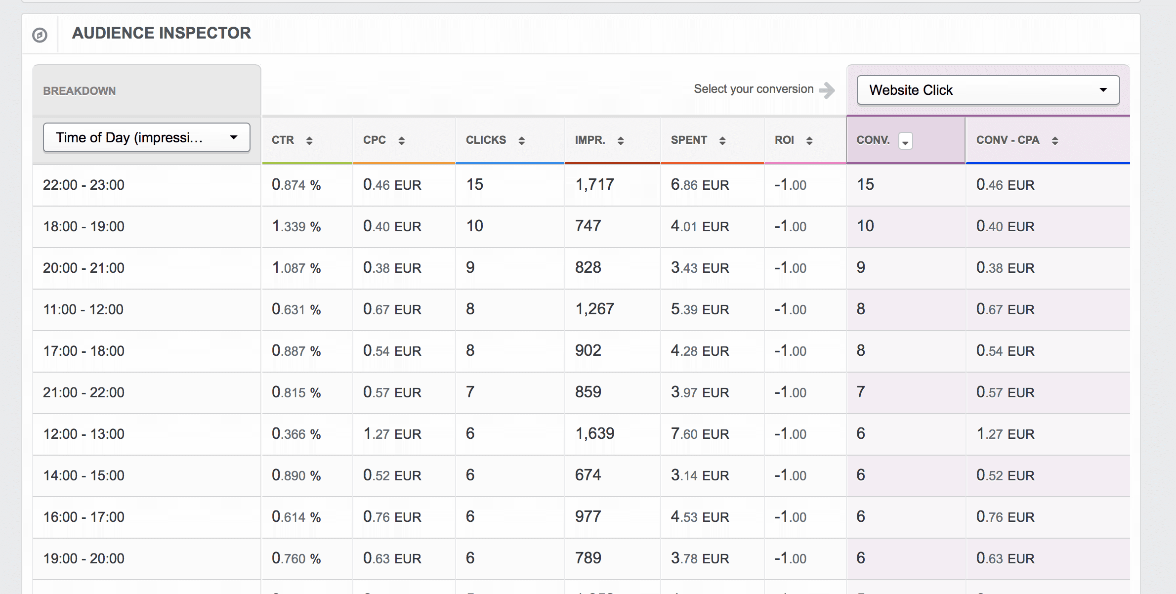 In AdEspresso, we have the Audience Inspector Tool which allows you to recognize the best-performing advertising times. This data allows you to quickly see exactly what hours of the day (in either the impression time zone or your ad account time zone) are performing the best, according to the KPI most important to you.