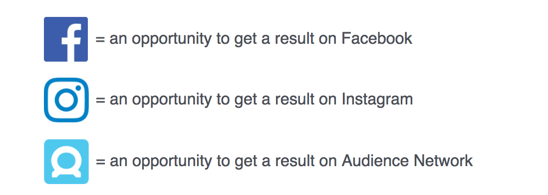 In this first example, all three Facebook placements have an average cost per result of $3, Instagram placements have an average cost per result of $5, and Audience Network placements have an average cost per result of $1.