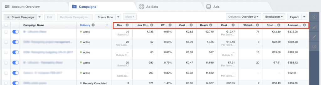 As you look at the Campaigns tab in the Ads Manager, you’ll notice the reporting table with different metrics such as: