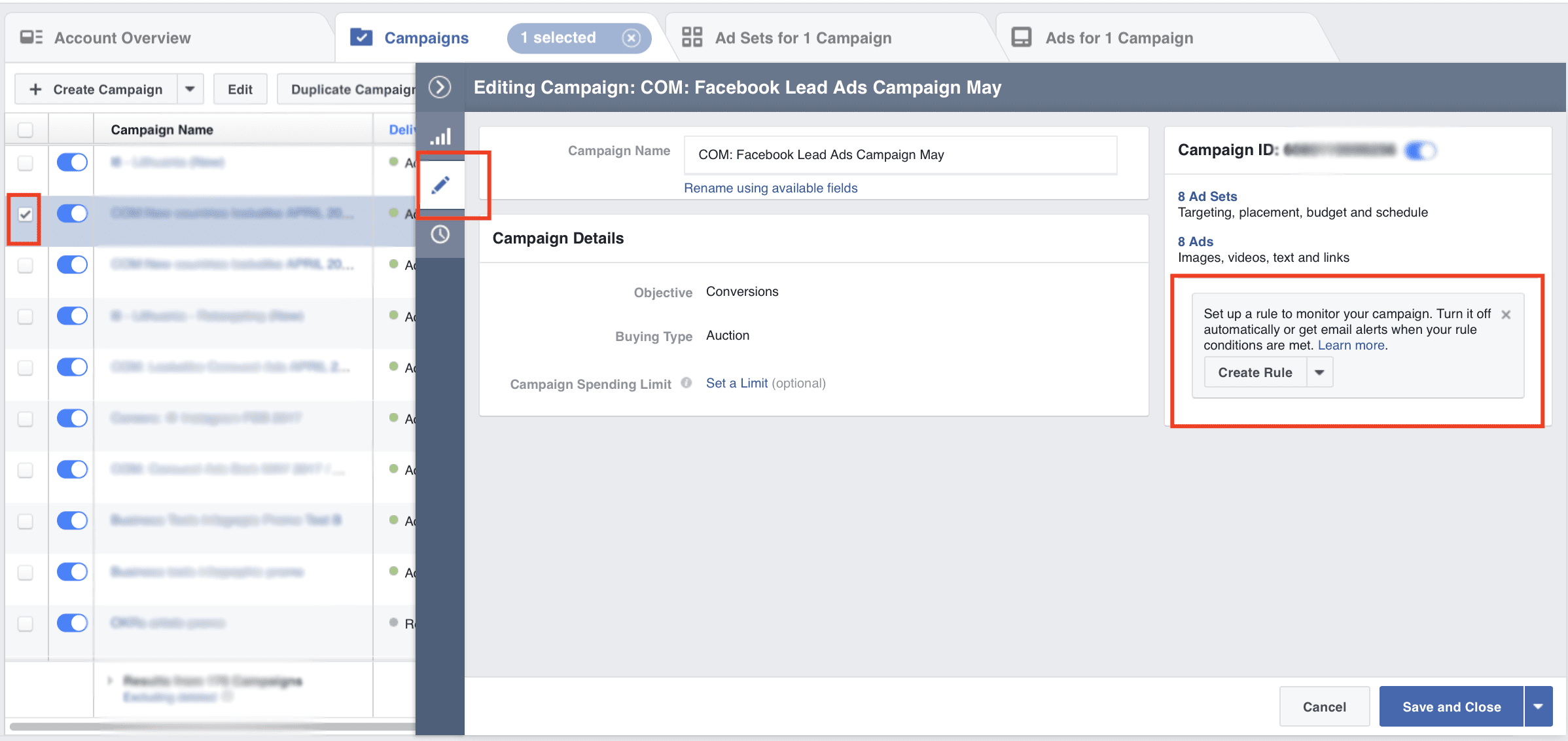 - 4 – When setting up a new Facebook ad campaign, select a ruleset you’d like to apply
