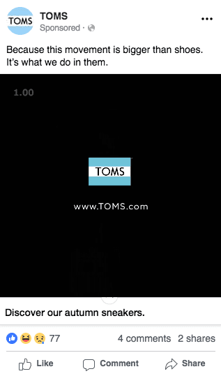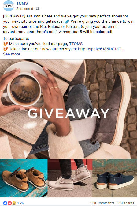 To participate in the giveaway you had to have to visit a specific landing page (which was specifically built for this campaign – another customization!) to choose their favorite pair and comment telling TOMS. Hence, the 1.3 thousand comments on this ad (by the way, they got more comments than reactions!).