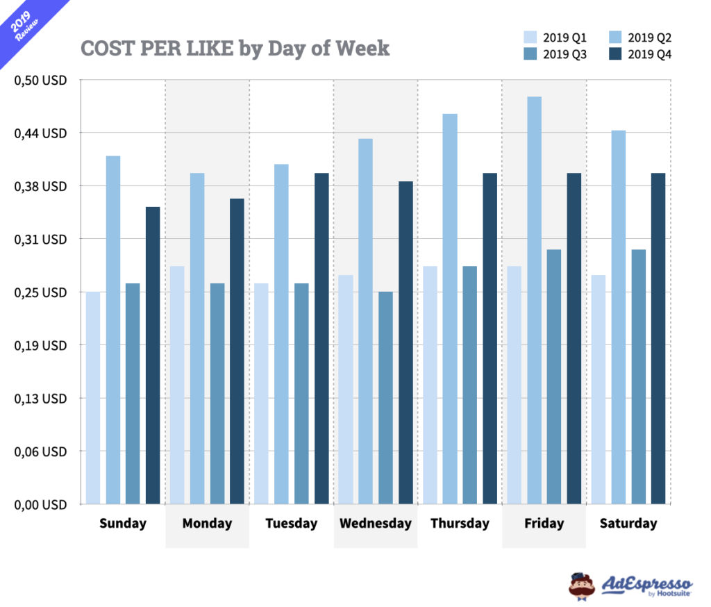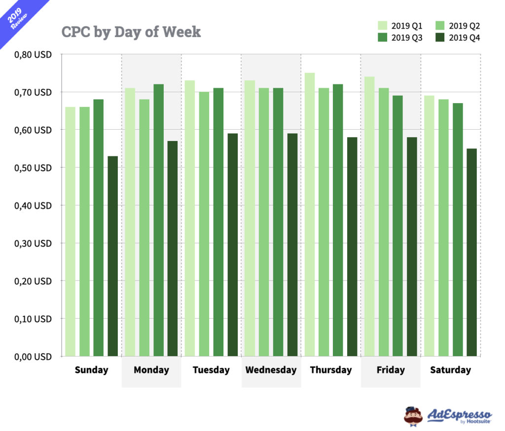 The number of active advertisers remains almost the same throughout the week. Still, the number of active social media users increases on the weekend, increasing the ad space’s size and effectively making the CPC more affordable.
