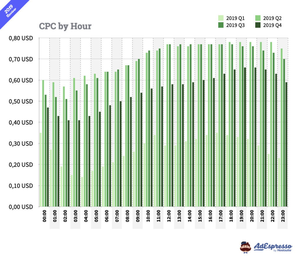 During Q4 in 2020 we can see that there were very few hours with a lower CPC as the CPC stayed more or less the same right up to midnight and only then saw a small drop overnight.