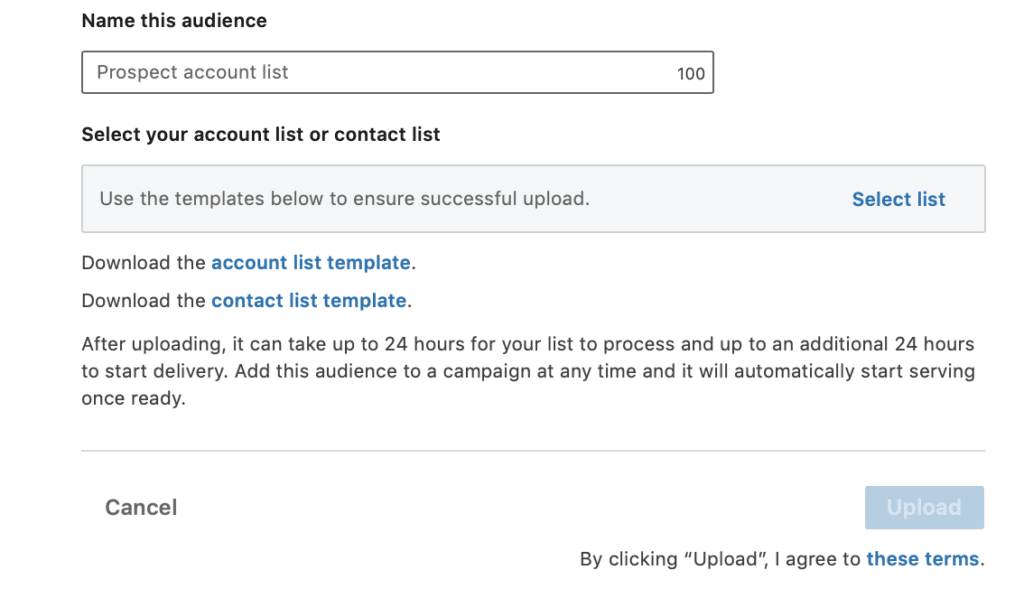 If you’d rather opt for a customer list, LinkedIn will provide different templates to allow you to target by accounts or emails. Download these and fill them out as needed, then upload them back to the platform.