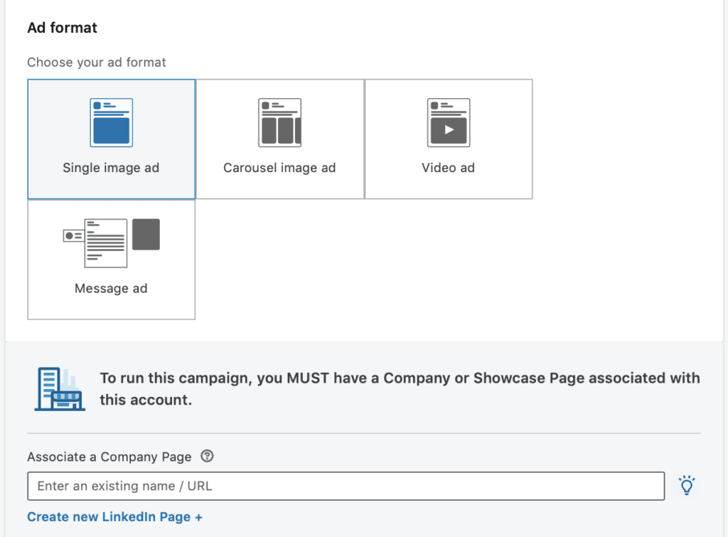 If you haven’t been on LinkedIn Ads recently, you’ll notice that this is new; previously, you’d select an ad format first, but now the ad creation process looks a little more like Facebook’s.