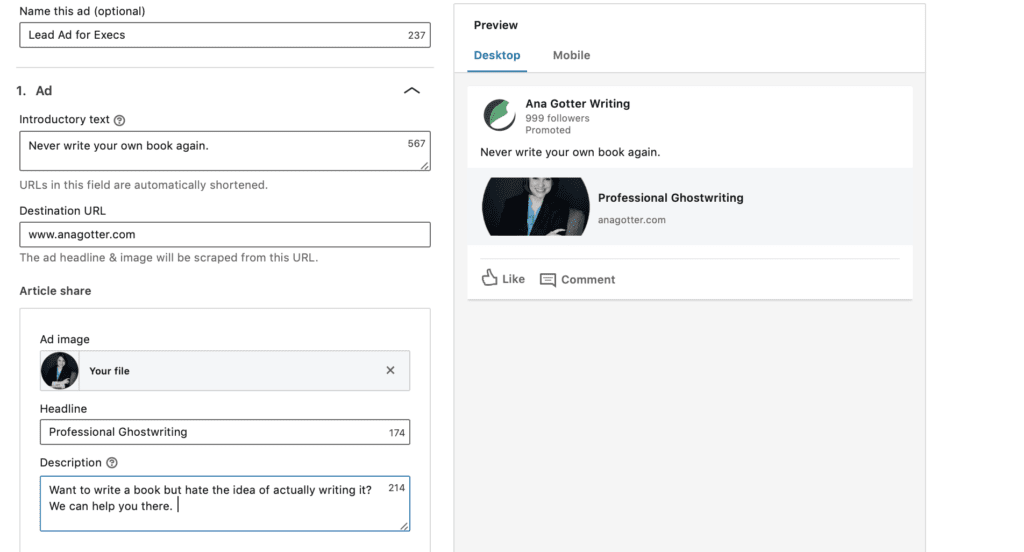 - You get 50 characters for the headline, 70 for the description, and 25 for the CTA