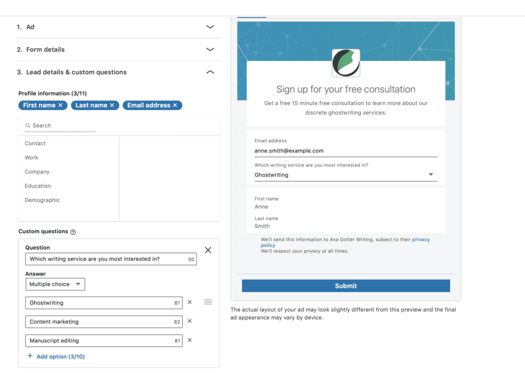 If you want to use Lead Generation ads and the lead gen ad format, keep in mind you’ll need to choose a “Lead Generation” option instead of “Sponsored content” when creating your ad, but they are otherwise similar.