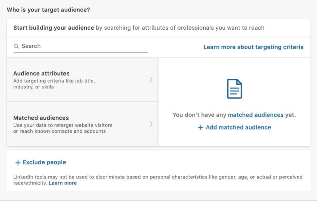 You can create Matched Audiences from your ad creation tool when creating LinkedIn campaigns. This can be an essential part of running ad campaigns on LinkedIn, so we wanted to walk you through it here.