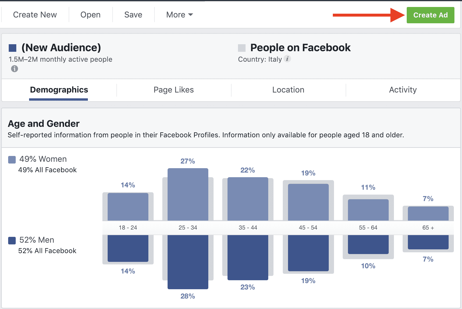 You can also open a Saved Audience that you created previously using Audiences Insights or Ads Manager, but ensure it doesn’t contain a custom audience if you created it in Ads Manager. Otherwise, you won’t be able to analyze it.