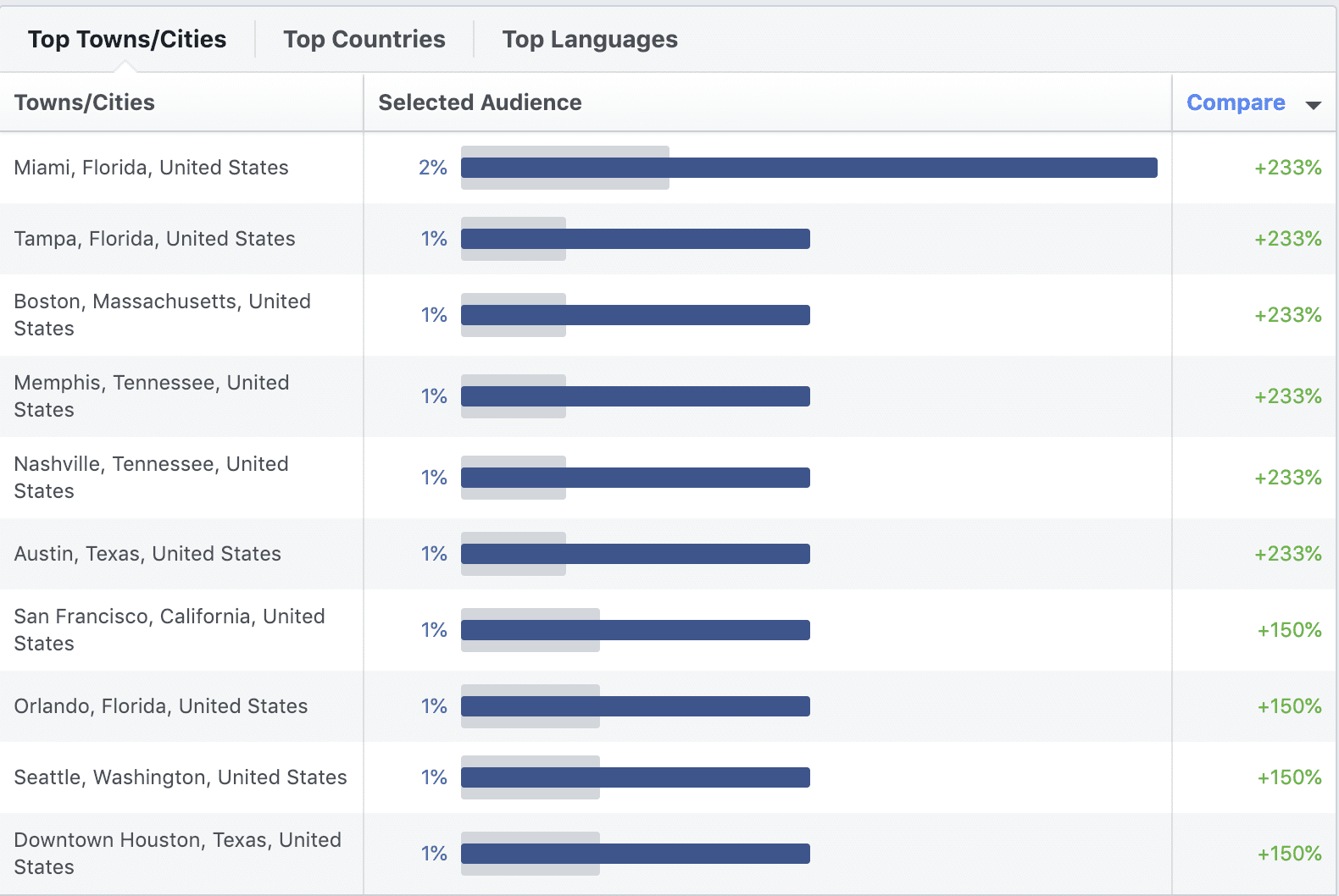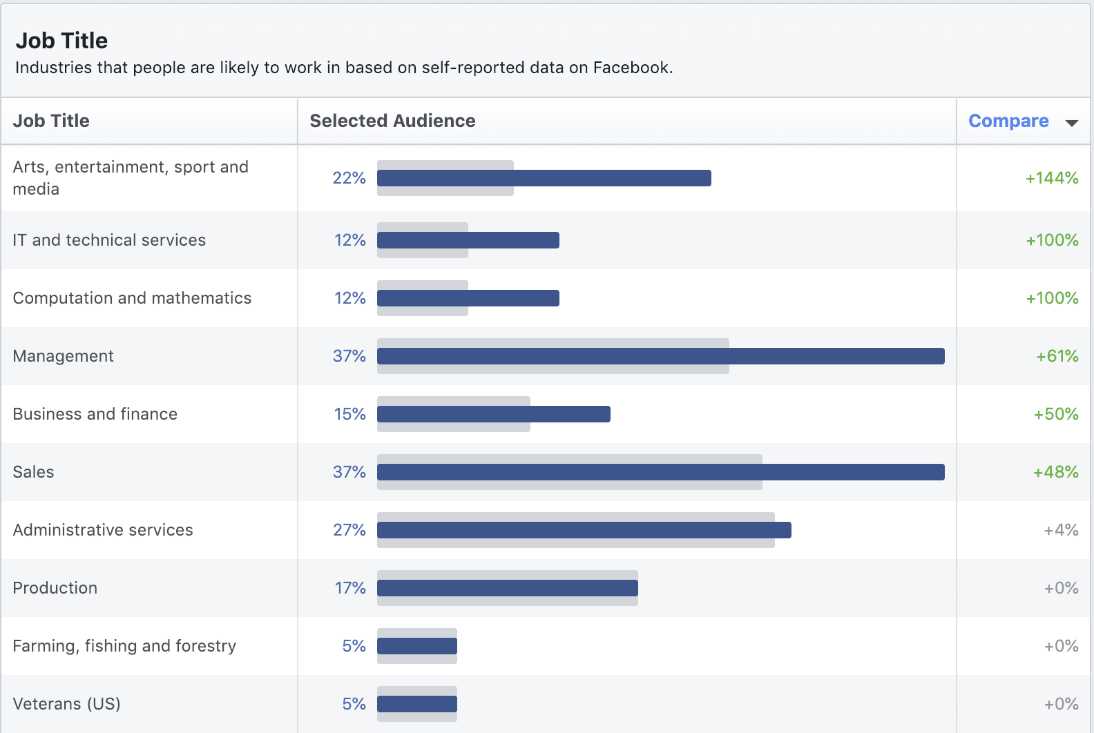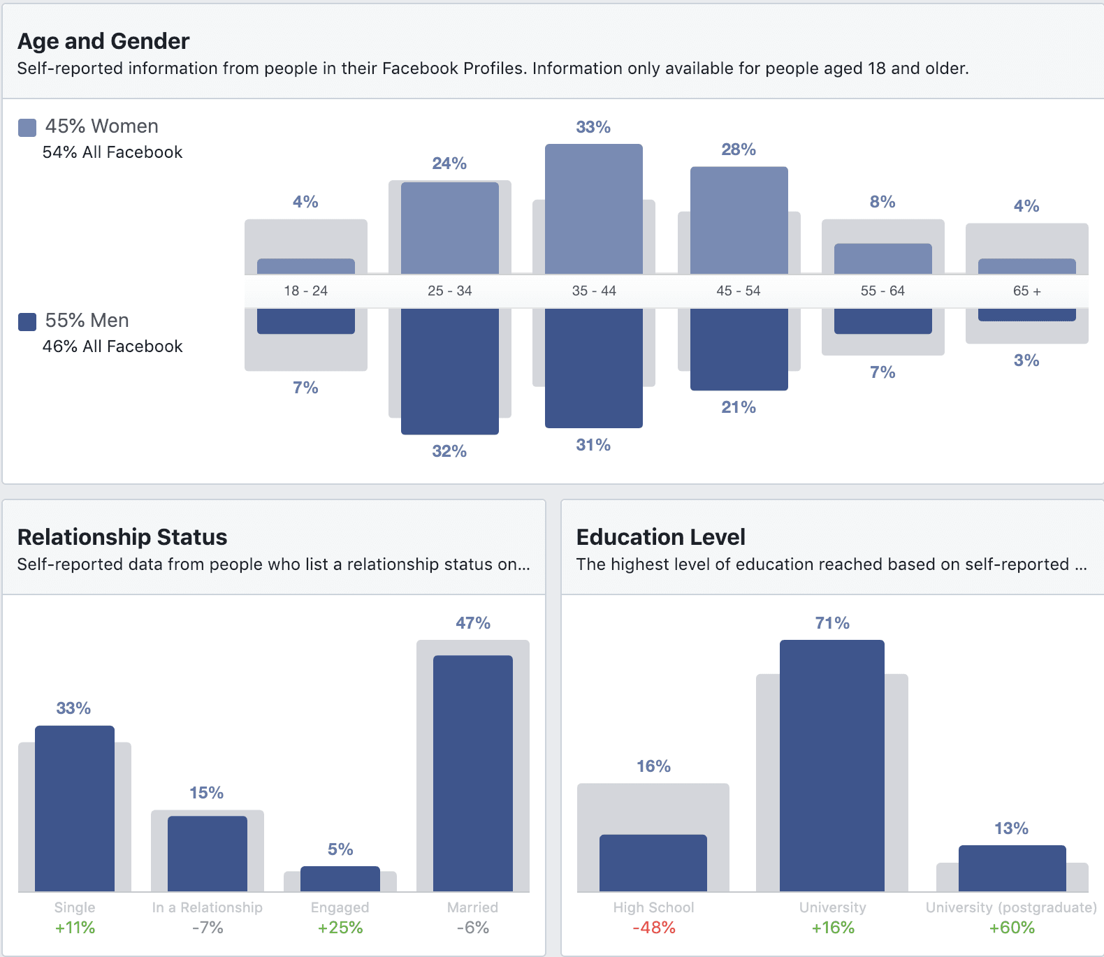 The gray bars are the averages for all Facebook users in that demographic and the blue bars represent your chosen audience.
