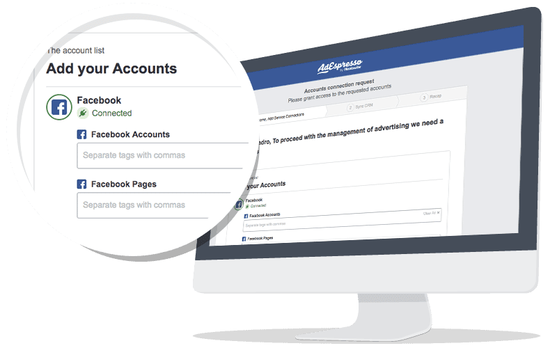 With AdEspresso’s Onboarding Requests feature, it will take you minutes to onboard even the largest client you can think of! AdEspresso will automatically connect your Business Manager to their pages and ad accounts, and your Facebook profile will be added to their Business Manager. You can also customize the connection page with your own logo to make the process clearer. Want to add their CRMs or Ad Platforms accounts? Just a few more clicks and that’s it; you’re all set!